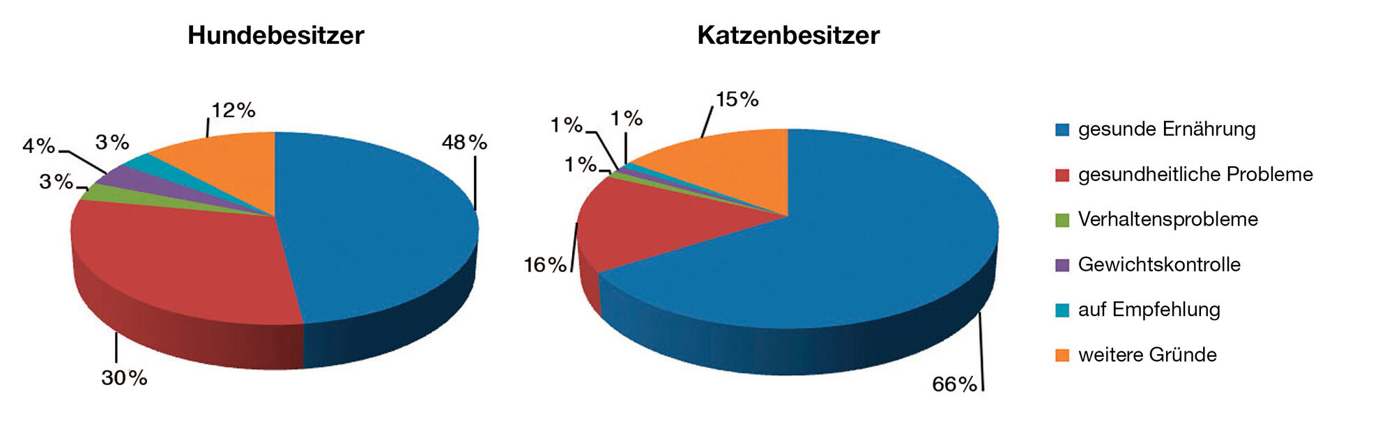Der wichtigste Beweggrund der Besitzer für BARF ist der Wunsch nach „natürlicher, gesunder Fütterung“ (Abbildung 2) [3] [4]. Als weiterer Grund für die Umstellung auf BARF werden oft chronische Erkrankungen genannt, wie Hauterkrankungen, Magen-Darm-Erkrankungen und Allergien, für die die Besitzer Besserung durch die neue Ernährungsform erhoffen. Dazu kommt, dass es in den letzten Jahren immer wieder Publikationen in den Medien gab, dass kommerzielles Fertigfutter nur „Abfälle und chemische Zusätze“ enthalte und an „Zivilisationserkrankungen“ schuld sei. Sie verunsichern viele Tierbesitzer und lassen sie nach „gesünderen“ Alternativen suchen.