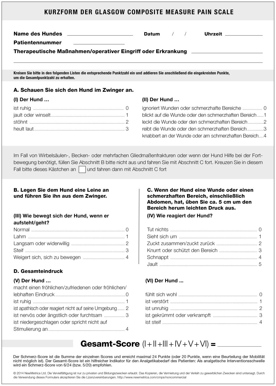 Informationsverarbeitungssystems und das Ergebnis eines komplizierten Zusammenspiels fazilitatorischer und inhibitorischer Pathways im peripheren und zentralen Nervensystem. Adaptiver „physiologischer“ Schmerz (z. B., sich den Zeh anstoßen) dient dem lebenswichtigen Zweck einer schnellen Veränderung des Verhaltens, um Schäden zu vermeiden oder weitere Schäden zu minimieren. Maladaptiver „klinischer“ Schmerz repräsentiert dagegen eine Malfunktion der neurologischen Übertragung und dient keinem physiologischen Zweck. Unzureichend kontrollierter akuter Schmerz führt zu Beschwerden und Leiden, hat aber darüber hinaus noch weitere unerwünschte Folgen, die eine Erholung verzögern oder beeinträchtigen können. Unkontrollierter postoperativer Schmerz kann zu verzögerter Heilung, erhöhter Morbidität und einem erhöhten Risiko der Entwicklung sehr schwierig zu behandelnder chronisch persistierender Schmerzen führen – Vorbeugen ist also besser als Heilen. Eine wirksame Schmerztherapie setzt eine korrekte Schmerzbeurteilung voraus. Die Schmerzbeurteilung ist ein routinemäßiger Bestandteil der Nachsorge während der gesamten postoperativen Phase. Sie muss aber auch vor und nach jeder Applikation von Analgetika durchgeführt werden, um deren Wirksamkeit zu überprüfen.Die Kurzform der Glasgow Composite Measure Pain Scale (CMPS-SF) wurde als ein praktisches Instrument für die Entscheidungsfindung bei Hunden mit akuten Schmerzen entwickelt und zeichnet sich insbesondere durch ihre einfache und zuverlässige Anwendbarkeit in der Praxissituation aus. Das Beurteilungssystem beinhaltet 30 Deskriptoren innerhalb von sechs Verhaltenskategorien, einschließlich Mobilität. Innerhalb jeder Kategorie sind die Deskriptoren nach assoziiertem Schmerzgrad in numerischer Rangfolge geordnet. Die Person, die die Schmerzbeurteilung durchführt, wählt den Deskriptor, der das Verhalten bzw. den Zustand des Hundes in der jeweiligen Kategorie am besten beschreibt. Wichtig ist, dass der Ablauf der Beurteilung exakt dem umseitigabgedruckten Protokoll folgt. Der finale Schmerz-Score des Patienten ist die Summe der einzelnen Scores und erreicht maximal 24 Punkte (oder 20 Punkte, wenn eine Beurteilung der Mobilität nicht möglich ist). Der Gesamt-Score ist ein hilfreicher Indikator für den Analgetikabedarf des Patienten: Als analgetische Interventionsschwelle wird ein Schmerz-Score von 6/24 (bzw. 5/20) empfohlen. Zu beachten ist, dass die Schmerz-Skala nur bei Hunden angewendet werden sollte, die bei vollem Bewusstsein sind und sich ohne Hilfe fortbewegen können (ausgenommen sind Fälle, in denen Mobilität kontraindiziert ist). In der Regel sollte man also mit dem Beginn der Schmerzbeurteilung zwei Stunden nach der endotrachealen Extubation warten, jeder Fall muss diesbezüglich aber individuell bewertet werden. Da das Protokoll der Schmerzbeurteilung eine Palpation im Bereich der Operationswunde und eine Evaluation der Mobilität einschließt (wenn Letztere nicht kontraindiziert ist), wird empfohlen, dieses Scoring in der frühen postoperativen Phase nicht häufiger als stündlich vorzunehmen, um unnötigen Stress für den Patienten zu vermeiden und schädliche Auswirkungen häufiger Störungen auf die nachfolgenden Messungen so weit wie möglich zu begrenzen.
