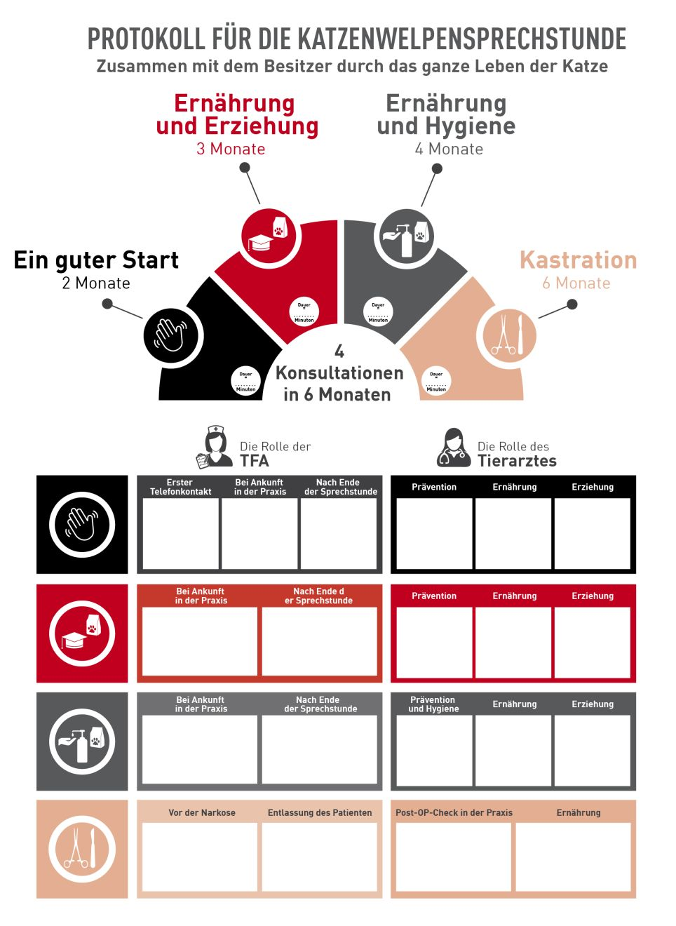 Lassen Sie uns zum Schluss betrachten, wie eine „Infografik zur Katzenwelpensprechstunde“ dazu beitragen kann, eine große Menge verschiedener und komplexer Informationen in einem klaren und optisch ansprechenden Schaubild für das Sprechzimmer zusammenzufassen (Abbildung 5). Bei dieser Infografik handelt es sich um ein umfassendes Protokoll im Format eines laminierten DIN A3-Posters, das es dem Team ermöglicht, die Katzenkonsultation individuell anzupassen, sich dabei aber gleichzeitig nach dem vorgegebenen Protokoll zu richten. Zusätzlich kann diese Grafik auch dem Tierhalter als Ausdruck ausgehändigt werden, um den jährlichen Konsultationsplan der Praxis besser zu erläutern und dem Besitzer zu verdeutlichen, welche Leistungen die Praxis anzubieten hat.