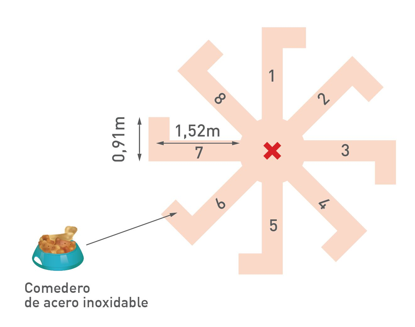 En este estudio participaron cachorros cuyas madres recibieron durante la gestación y la lactancia un alimento no suplementado con DHA. A los cachorros destetados se les asignó aleatoriamente un alimento alto o bajo en DHA (Tabla 1). Se realizaron pruebas de función cognitiva utilizando un laberinto radial de 8 brazos, en los que al final de cada uno de ellos se encontraba una puerta numerada que podía abrirse o cerrarse de forma independiente (Figura 3). Este estudio se diseñó para valorar la orientación espacial y la capacidad de memorizar una lista a corto plazo (efecto de recencia), medio plazo y largo plazo (efecto de primacía). Se empezó a realizar la prueba del laberinto a las 15 semanas de edad; al igual que en los estudios anteriores, el cachorro tenía que entrar en un brazo del laberinto para conseguir una recompensa de comida, pero en este caso, el estudio incluyó cuatro fases de dificultad creciente. Al principio se analizaron los datos teniendo en cuenta los posibles efectos debidos a la repetición, el sexo, la alimentación y las interacciones asociadas, pero se comprobó que los efectos de los dos primeros factores no eran significativos, por lo que se eliminaron del modelo y en el análisis final solo se incluyó la alimentación.
