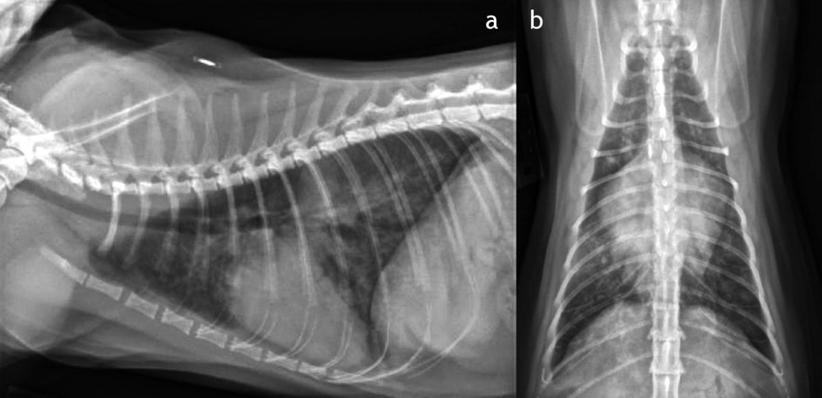 La fréquence et les efforts respiratoires seront observés lorsque le patient est calme. Malheureusement, l’auscultation des poumons n’est pas un moyen fiable pour mettre en évidence un œdème pulmonaire ou une effusion pleurale chez les chats. Par conséquent, si des signes cliniques d’ordre respiratoire sont visibles chez le chat, trois radiographies thoraciques (deux vues latérales et une ventrodorsale) seront réalisées ( Figure 1 , Figure 2 et Figure 3 ). L’abdomen sera palpé doucement pour repérer une éventuelle organomégalie ou une ascite, qui pourrait orienter vers une insuffisance cardiaque droite. De même, une congestion veineuse générale et/ou un pouls jugulaire indiquent une affection du cœur droit. Les anomalies cardiaques congénitales les plus fréquentes chez le chat sont listées dans le Tableau 1.