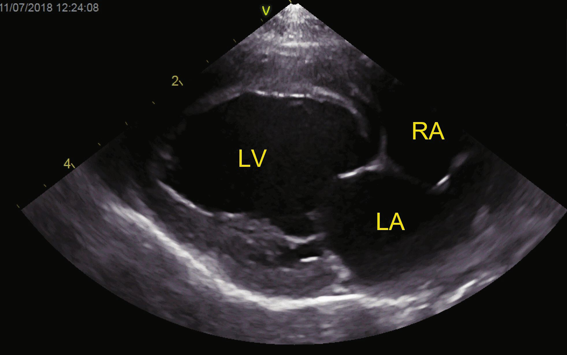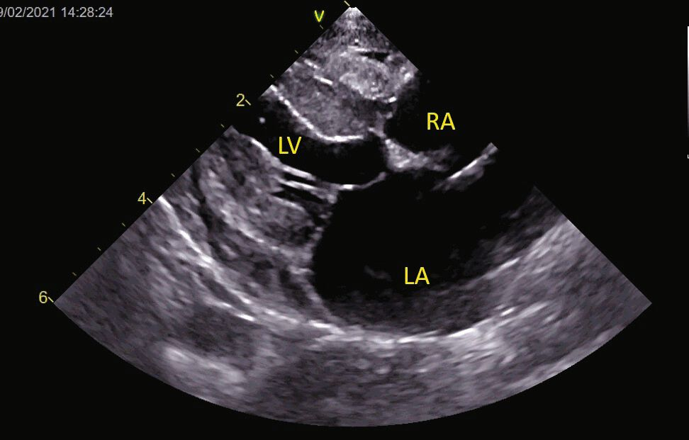 4. Cardiomyopathie dilatée (CMD) [2]. Autrefois associée à une carence en taurine, elle est aujourd’hui devenue rare, mais les cas actuels peuvent être liés à un problème génétique ou nutritionnel (par exemple, les régimes sans céréales). L’échocardiographie peut montrer une dilatation du VG en systole (> 12 mm) et en diastole (> 18 mm), avec une paroi relativement mince. Ce tableau peut également être observé au stade terminal d’autres cardiomyopathies (Figure 7).