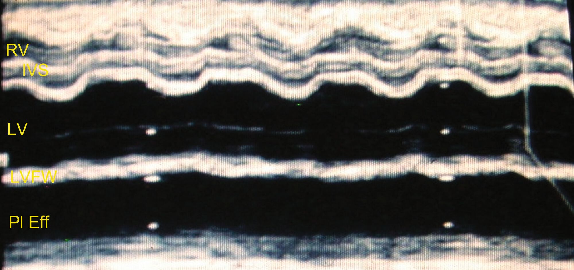 Abréviations : IVS : septum interventriculaire ; LA : atrium gauche ; LV : ventricule gauche ; LVFW : paroi libre du ventricule gauche ; RA : atrium droit ; RV : ventricule droit ; RVFW : paroi libre du ventricule droit ; PE : épanchement péricardique ; Pl Eff : épanchement pleural.