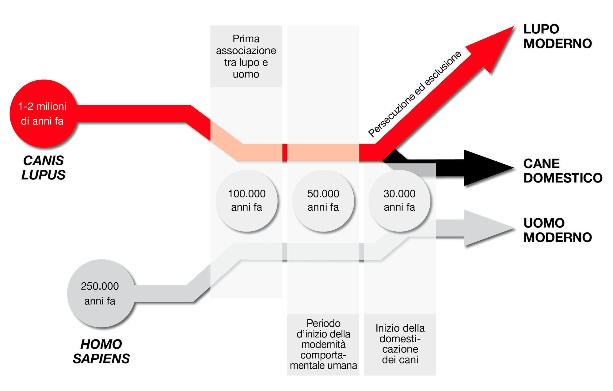 La storia della relazione uomo-cane è molto lunga. Si ritiene che gli Homo sapiens siano emersi in Africa circa 250.000 anni fa, dopo un periodo di crescente espansione del cranio nelle prime specie di ominidi iniziata 150.000 anni prima. Sebbene nel corso della storia della nostra specie esista un’evidenza di sviluppo graduale per quanto riguarda l’uso degli utensili e il progresso culturale, sembra esserci stato un salto nello sviluppo culturale che è culminato nella “modernità comportamentale” circa 50.000 anni fa, in particolare con la presenza di cultura simbolica, linguaggio e tecnologia specializzata: ciò contiene tutti gli elementi riconoscibili nelle civiltà successive, compresa la custodia degli animali (Figura 1).