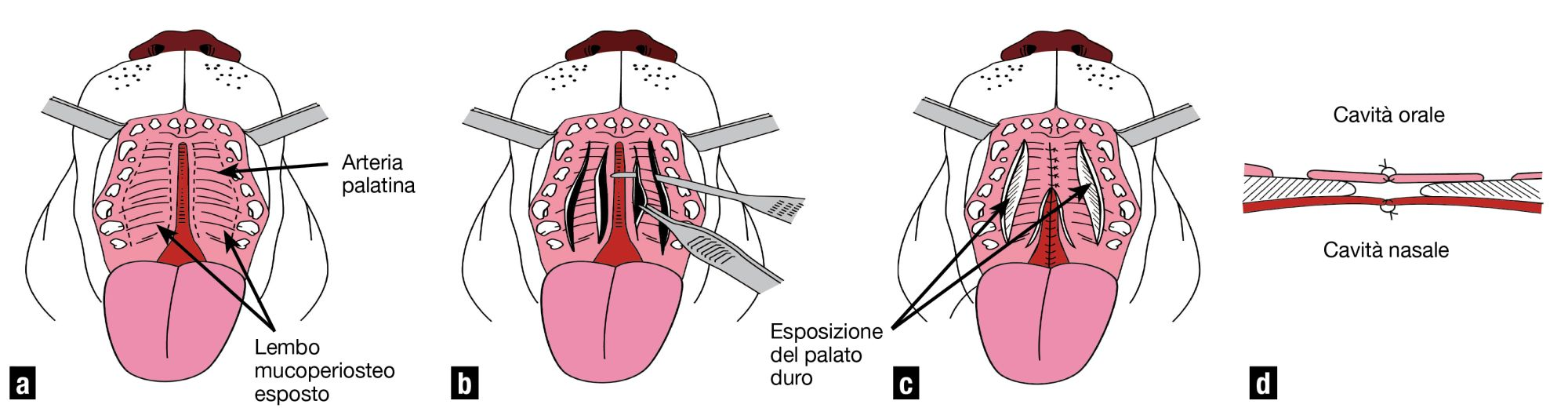 La palatoschisi è causata dalla fusione nulla o incompleta dei piani palatini durante lo sviluppo fetale, e si presenta clinicamente come un difetto longitudinale del palato primario (osso incisivo) e/o secondario (osso mascellare, osso palatino e palato molle) (Figura 15). Ciò comporta l’impossibilità per l’animale affetto di poppare. Inoltre, capita spesso che il cibo venga inalato nelle vie respiratorie, con conseguente polmonite. Dal punto di vista clinico, l’animale affetto mostra tosse e starnuti, con presenza di latte alle narici durante la poppata. Questi animali hanno quasi sempre uno sviluppo fisico ritardato e sono spesso sottoposti a eutanasia. Nel caso si pianifichi la chiusura chirurgica del difetto, l’animale deve essere alimentato più volte al giorno con un sondino nasogastrico fino a raggiungere una dimensione ragionevole. L’intervento chirurgico può essere solitamente tentato a 2-4 mesi di età, quando l’animale è abbastanza grande da permettere la mobilizzazione estesa dei tessuti orali necessaria per consentire la chiusura della palatoschisi. L’intervento chirurgico deve essere attentamente pianificato, poiché il primo tentativo offre le migliori possibilità di successo. Nonostante ciò, sono spesso necessarie operazioni di follow-up per chiudere completamente il difetto. I due metodi più spesso utilizzati per chiudere la palatoschisi sono la tecnica di avanzamento a doppio peduncolo e la tecnica con sovrapposizione di lembi. Nel primo caso, si incidono i margini mediali del palato nell’area della palatoschisi e si sottomina la mucosa del palato. Alcune incisioni di rilascio laterali garantiscono la necessaria mobilità dei lembi mucoperiostei risultanti. L’apporto ematico dell’area fornito dall’arteria palatina maggiore deve essere preservato e i lembi mobilizzati il più possibile per consentire una chiusura senza tensione del difetto. Le incisioni di rilascio laterali guariscono per granulazione secondaria. Lo svantaggio di questo metodo è che le suture sono posizionate sopra il difetto e non hanno alcun supporto osseo. Per la tecnica con sovrapposizione di lembi, si prepara un lembo dalla mucosa palatina su un lato della palatoschisi, con l’incisione fatta parallelamente ai denti e la base del lembo situato a livello della schisi. Il lembo viene piegato sopra il difetto, tirato dal lato opposto della schisi, quindi suturato in posizione, in modo che l’ex epitelio orale formi il pavimento del naso e il lato di tessuto connettivo sia rivolto verso la cavità orale. Anche in questo caso, è di vitale importanza mantenere l’apporto ematico dall’arteria palatina maggiore. Il vantaggio di questo metodo è che le suture sono sostenute dall’osso, su un lato del difetto. Lo svantaggio è che la tecnica è più difficile, il che richiede una preparazione approfondita ed espone un’ampia area di osso alla granulazione [1] [2] [3] [4] [12] [13].