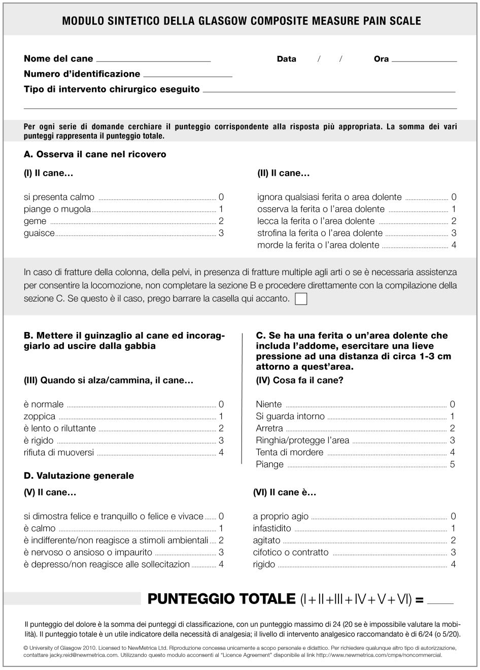 Il modulo sintetico (Short Form [SF]) della Glasgow Composite Measure Pain Scale (CMPS-SF) è stato concepito come uno strumento decisionale pratico nei cani con dolore acuto e può essere utilizzato in modo rapido e affidabile nell’ambiente clinico. Prevede 30 elementi descrittori, all’interno di 6 categorie comportamentali, compresa la mobilità. All’interno di ogni categoria, i descrittori sono classificati numericamente in base alla gravità del dolore associato; chi esegue la valutazione sceglierà il descrittore che si adatta meglio al comportamento/alla condizione del cane. È importante effettuare la procedura di valutazione come descritto a tergo.