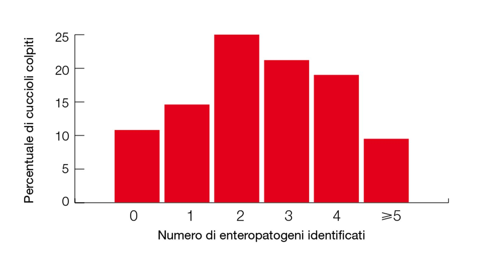 In terzo luogo, sono frequenti le coinfezioni e le interazioni tra enteropatogeni. Uno studio su 316 cuccioli con diarrea ha rivelato che il 75% di questi aveva più di un agente infettivo (Figura 2) [5]. Alcuni di questi agenti infettivi possono interagire e amplificare la gravità dei segni clinici; ad esempio, il coronavirus aggrava i segni clinici durante la coinfezione con CPV di tipo 2 [15].