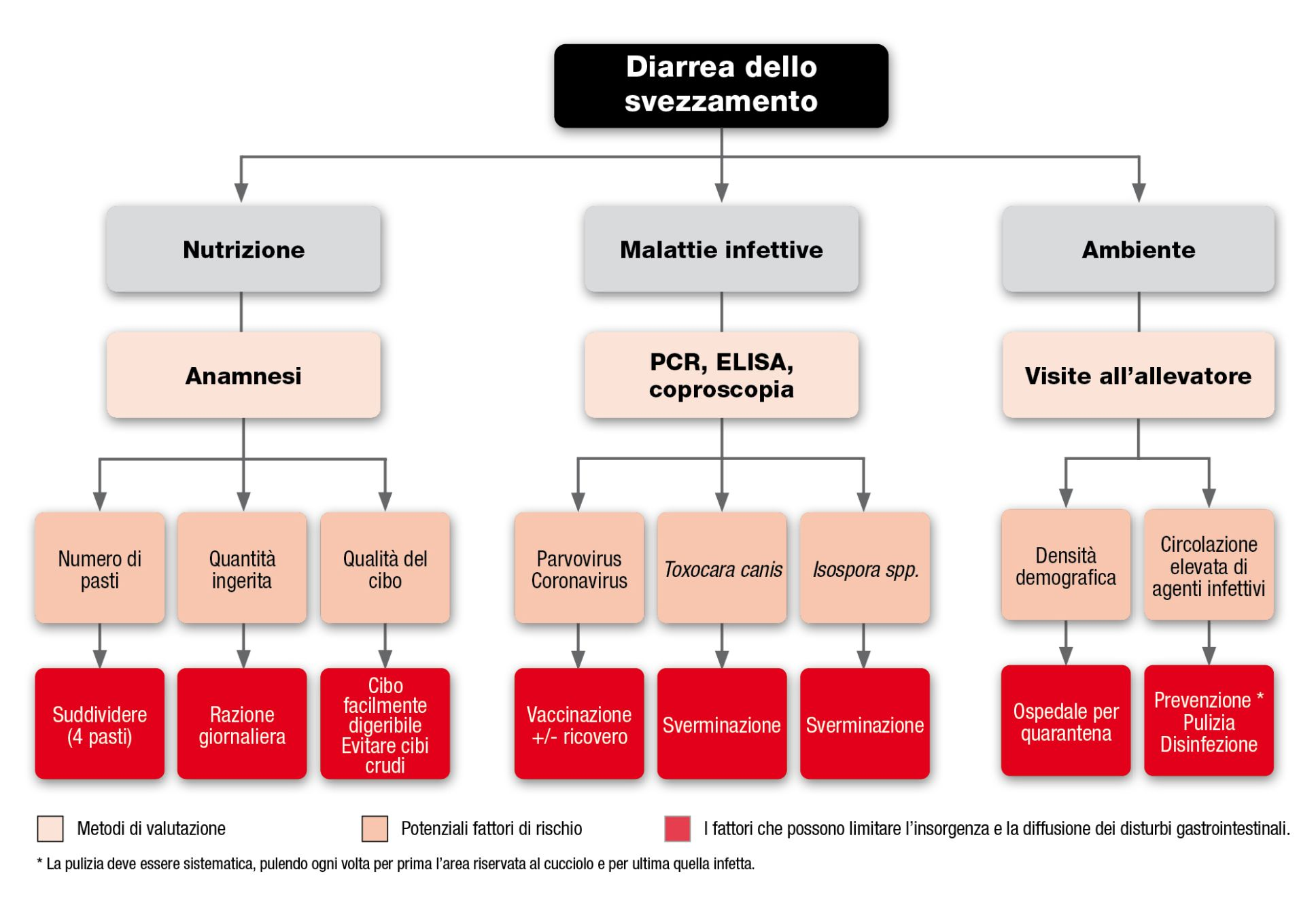 La qualità delle feci del cane può essere influenzata dalle caratteristiche dell’animale stesso (razza ed età), dalla presenza di enteropatogeni (virus, parassiti, batteri) e dalla dieta (errori nella transizione alimentare o nella qualità degli alimenti). La diarrea dello svezzamento è quindi un processo complesso risultante dall’influenza e dall’interazione di diversi fattori e la gestione di questo problema richiede un approccio globale che include aspetti nutrizionali, infettivi e ambientali. Ancora più importante, la prevenzione della diarrea allo svezzamento deve sempre coinvolgere un controllo dietetico accurato; al fine di garantire una transizione armoniosa tra latte e cibi solidi, si devono offrire alimenti molto digeribili e reidratabili ed è importante razionarli per evitare la diarrea da consumo eccessivo, suddividendo la razione giornaliera in quattro piccoli pasti (di norma) per facilitare la digestione.