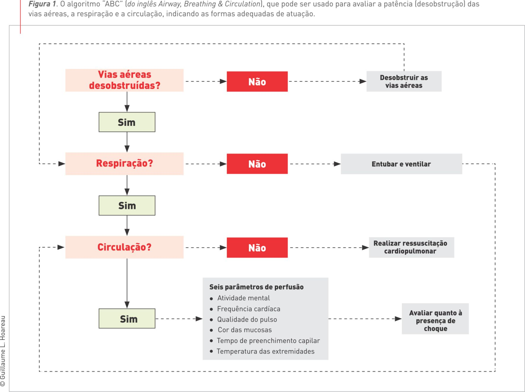 Tradicionalmente, para a avaliação inicial de triagem, emprega-se o algoritmo “ABC” (do inglês Airway, Breathing & Circulation), pois avalia a patência (desobstrução) das vias aéreas, a respiração (O paciente está respirando espontaneamente? Há sinais de angústia respiratória?) e a circulação (Há sinais de problemas circulatórios ou choque?) (Figura 1). A presença de choque pode ser determinada ao exame físico, avaliando-se os parâmetros de perfusão listados a seguir: atividade mental, frequência cardíaca, qualidade do pulso, cor das mucosas, tempo de preenchimento capilar e gradiente de temperatura entre o corpo e as extremidades.