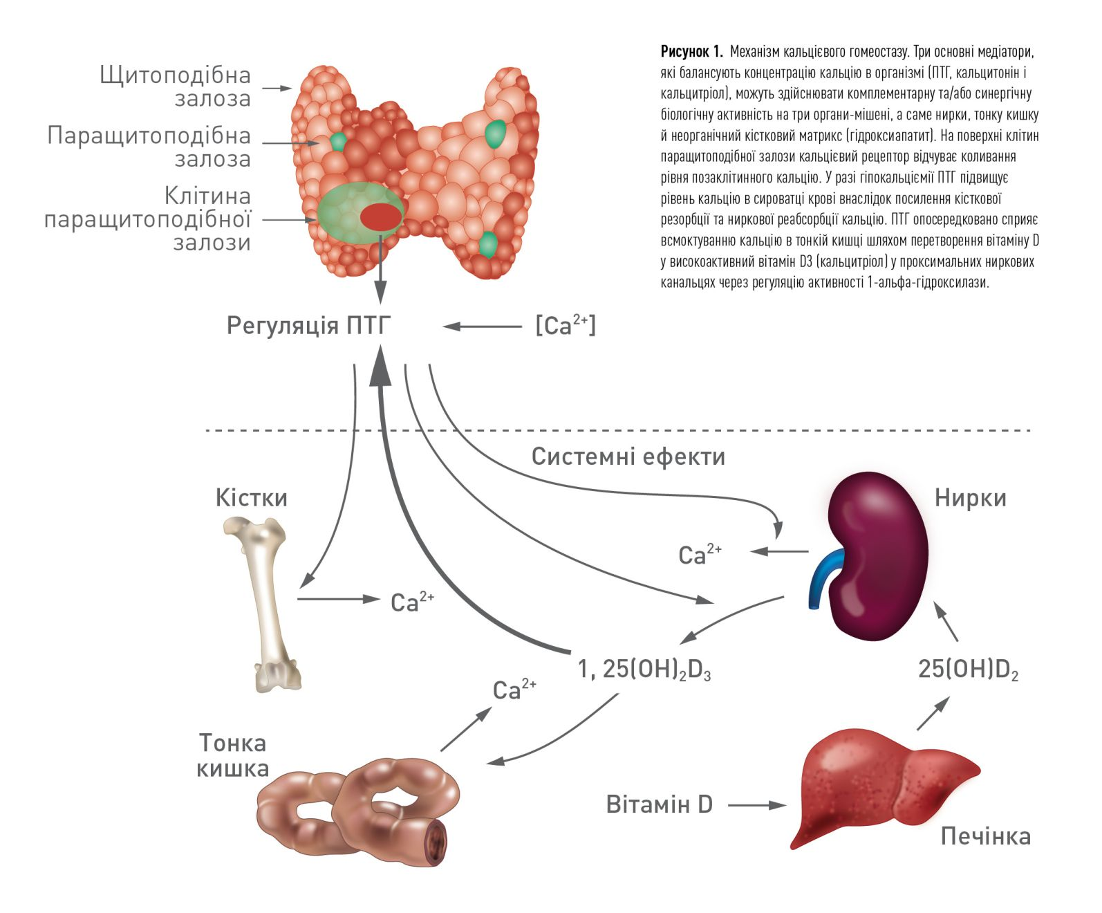 Три основні медіатори — паратгормон, кальцитонін і кальцитріол — відповідають за збалансування концентрації кальцію в організмі шляхом здійснення комплементарної та/або синергічної біологічної активності на три органи-мішені, а саме нирки, тонку кишку та неорганічний кістковий матрикс (гідроксиапатит) [1] (рисунок 1).